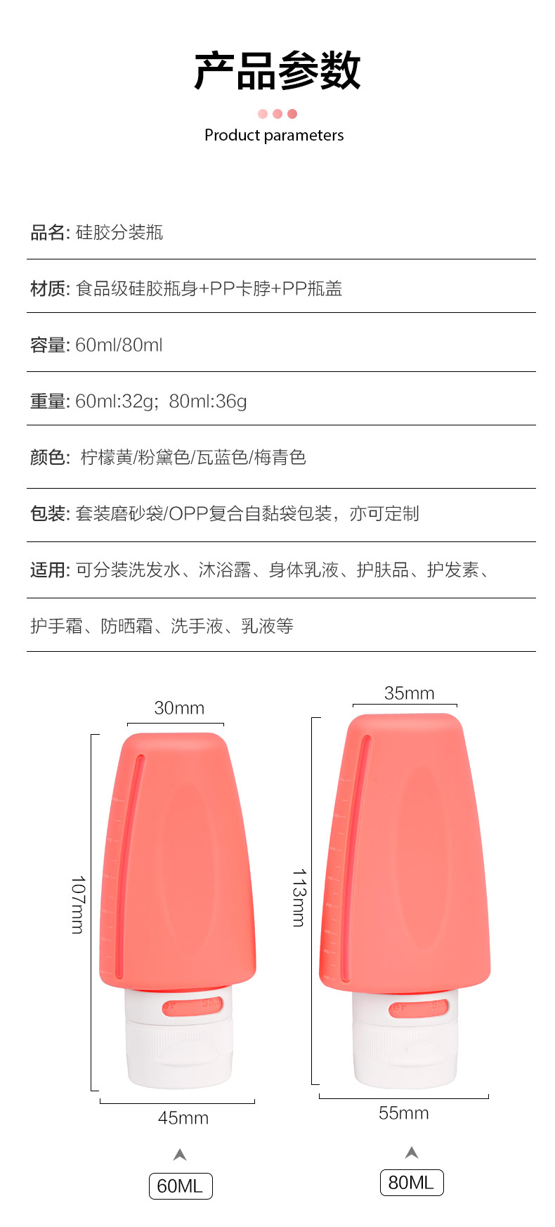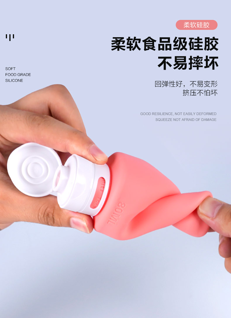 材質(zhì): 食品級硅膠瓶身+PP卡脖+PP瓶蓋