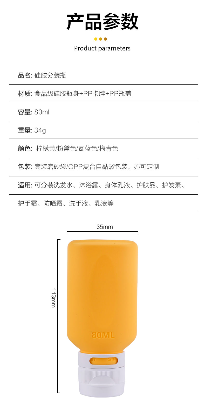 您的位置:首頁 > 產(chǎn)品中心 > 硅膠家居用品 > 硅膠乳液分裝瓶旅行便攜包裝80ml擠壓式乳液化妝品收納瓶